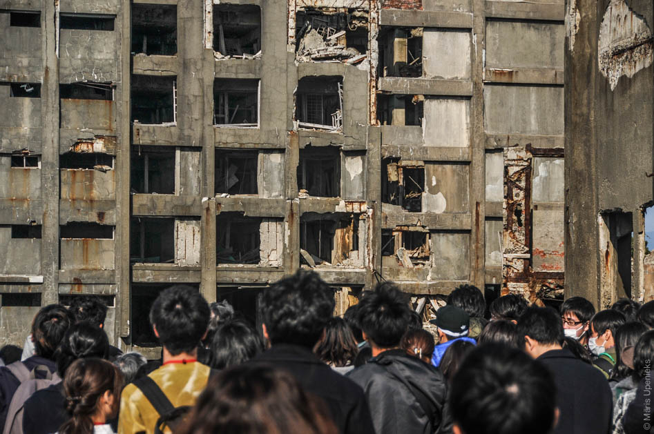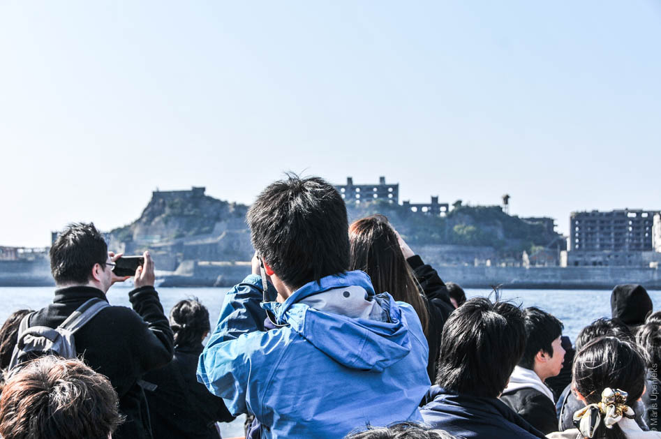 Par Gunkanjimas jeb Karakuģa salas (jo no attāluma tā tiešām atgādina karakuģi) eksistenci uzzināju pavisam nejauši – no Džeimsa Bonda piedzīvojumiem filmā Skyfall. Šī graustiem pieblīvētā un drupu pilnā, pabaisā vieta bija attiecīgi visai organisks mājoklis Bonda pretiniekam – ļaundarim, Havjera Bardema tēlotajam Silvam. Reālais stāsts ir ne mazāk iespaidīgs. Mazajā saliņā pie Japānas krastiem aizpagājušā gadsimta sākumā tika konstatētas bagātīgas ogļu iegulas. Tika sākta to ieguve, kas līdz 1974. gadam kopā sasniedza teju 16 miljonus tonnu. Lai lieli netērētos strādnieku transportēšanai, dzīvesvietas nolēma uzbūvēt tepat – kas laika gaitā rezultējās vairāk kā 5000 iedzīvotājos, cilvēku blīvumam uz kvadrātkilometru pārniedzot 80 000. Vieta, maigi izsakoties, intriģējoša. Skatoties Bonda filmu iztēlojos, kā, sadrupušām flīzēm zem kājām kraukšķot, kādudien būtu tik interesanti cēli pastaigāties pa šīs vietas spocīgajiem pagalmiem. Visums mani kārtējo reizi pacietīgi uzklausa, un, dažus gadus vēlāk esot Japānā, uzzinu, ka sala ir pavisam netālu no Nagasaki pilsētas, un uz to iespējams tikt ar tūristu kuģīti. Ilgi nedomāju.