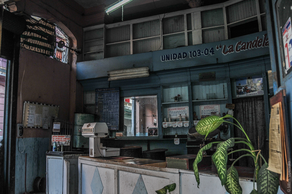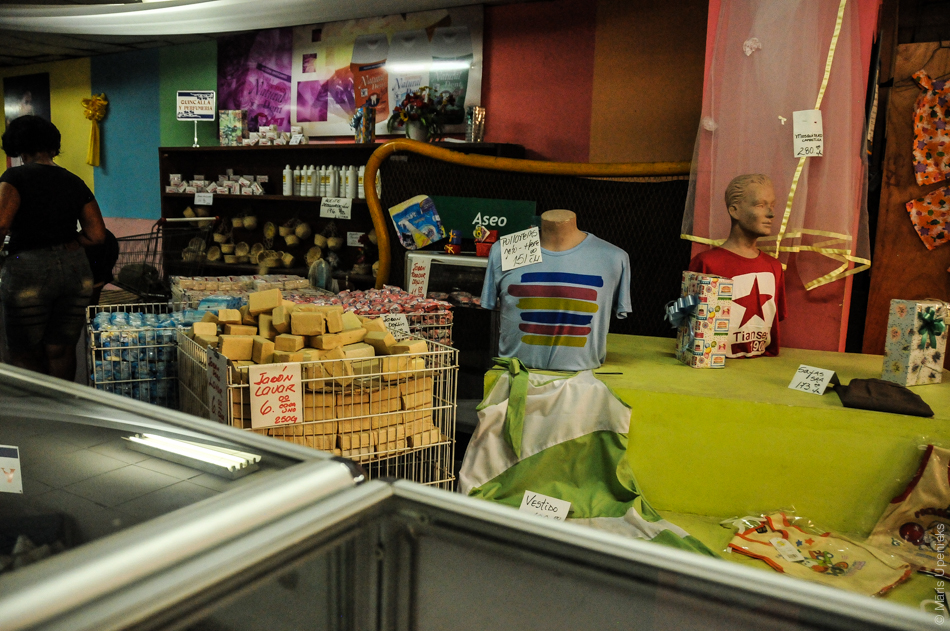 Vietējā bodīte. Kā redzams, sortimentā ir desas un rums. Šis dzēriens šeit ir ekvivalents Krievijas situācijai – lai nu ko, bet cenas vodkai jāpaaugstina pēdējās – alkoholam jābūt tautai pieejamam, lai nesadomā revolucionēties. Tā arī Kubā – rums, arī mūspusē labi zināmais Havana Club, maksā lūpu kaktiņus krietni uz augšu savelkošas summas.