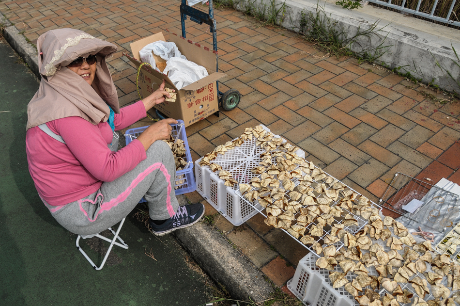 Dāma turpat uz tilta trotuāra žāvē labumus, kas visticamāk noderēs tradicionālajā ķīniešu medicīnā.
