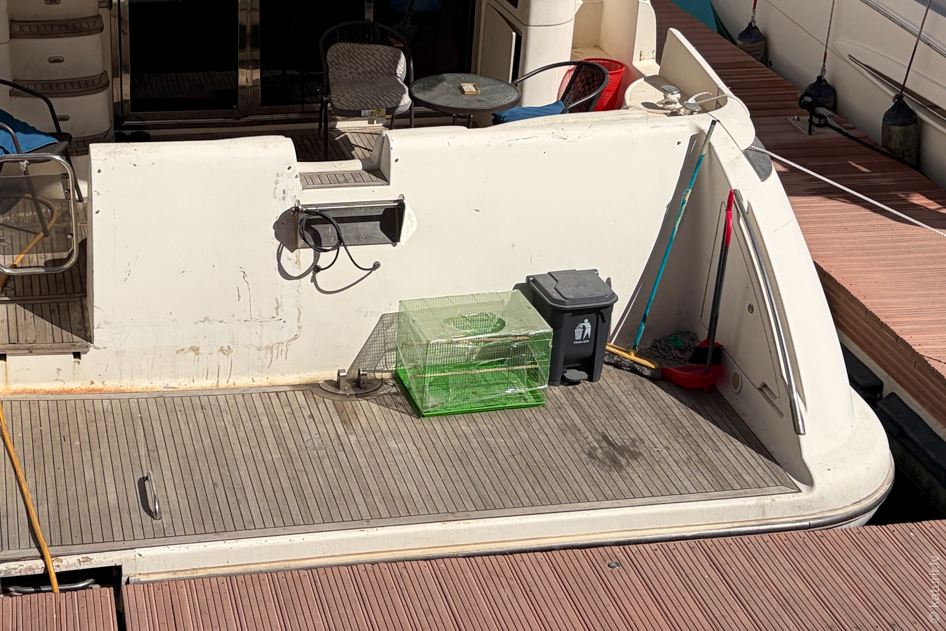 Uz kādas jahtas karstajā saulē mētājas putnubūris. Ceru, ka tukšs.