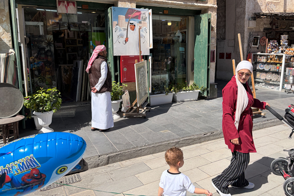 Tiekot ārā, pamanu arī Kataras vadoņu portretu un citas mākslas veikaliņu.