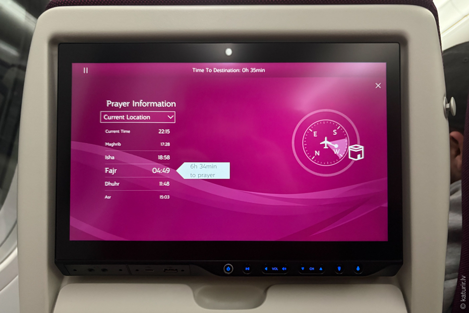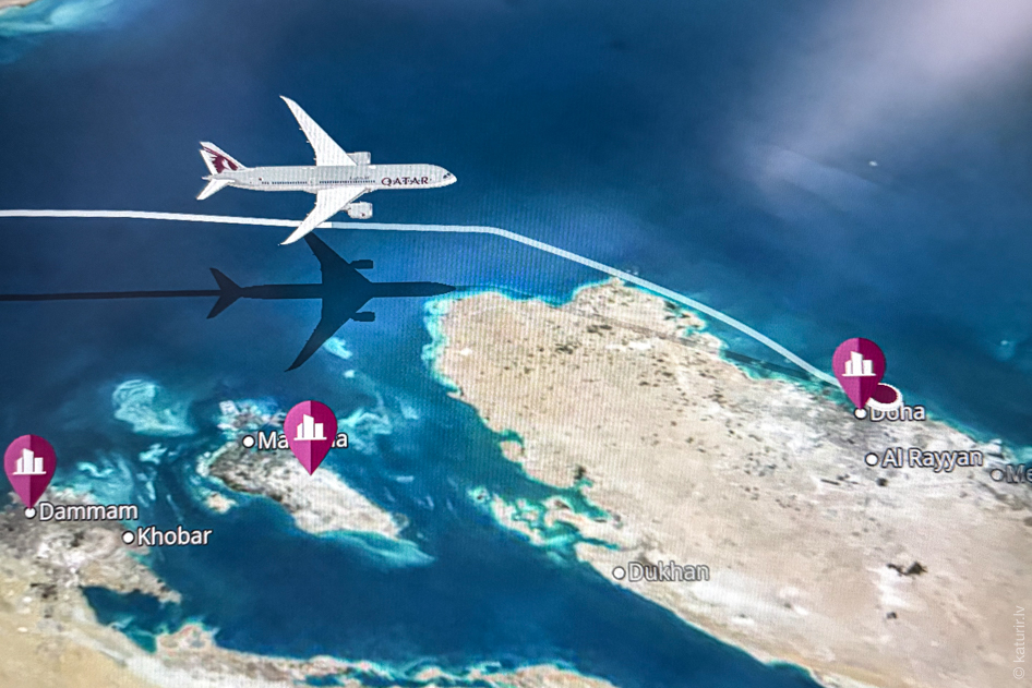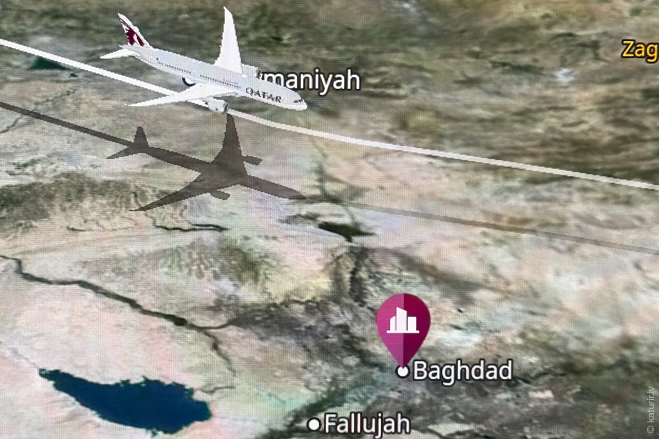 Uz Kataru visskaistāk lidot ar aviokompāniju, kam ir tāds pats nosaukums. Qatar Airways dažādos reitingos atzīta par vienu no labākajām aviokompānijām pasaulē un jāatzīst, ka līmenis arī ekonomiskajā klasē ir visām maņām visnotaļ patīkams. Baudi tu tāds vēsu dzērienu, liegi slīdot pāri Bagdādei.