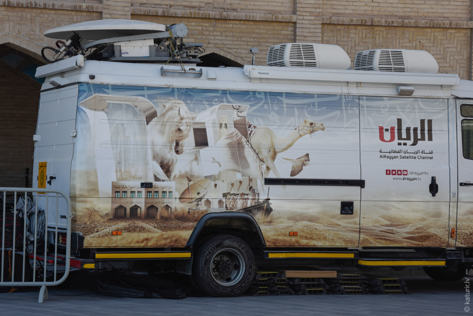 Pat vietējās televīzijas busiņš šeit izskatās prēmium – auļojoši balti zirgi, kamieļi, piekūni.