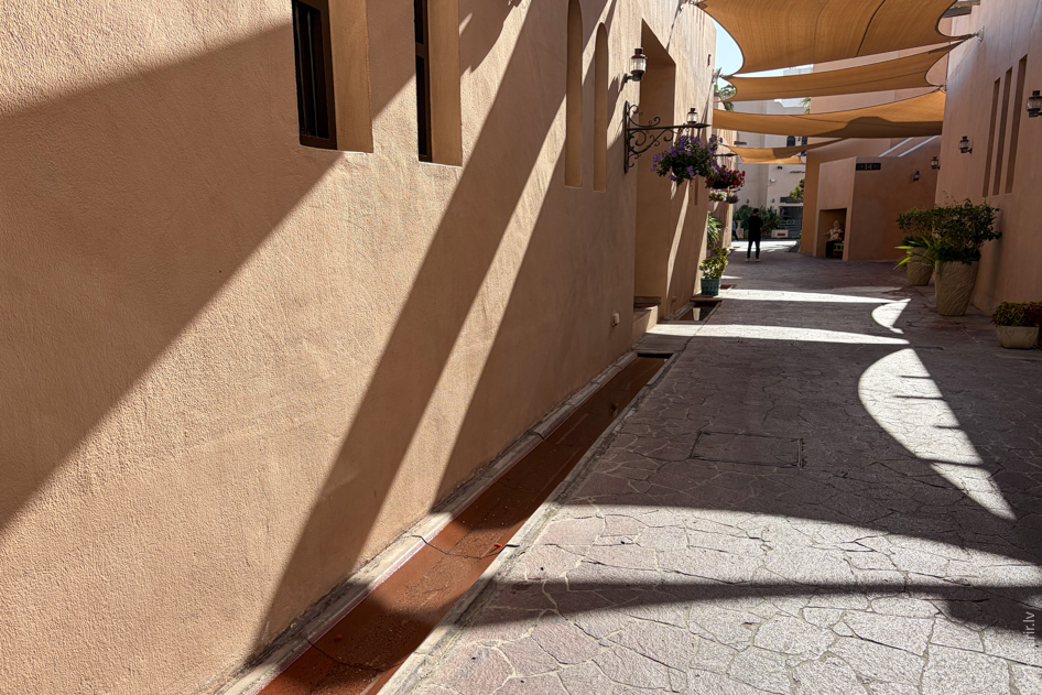 Arī šeit viss ir neticami sterils un tīrs. No saules aizsargā virs ielas nostieptas buras, gaisu atvēsina speciāls mākslīgais strautiņš.