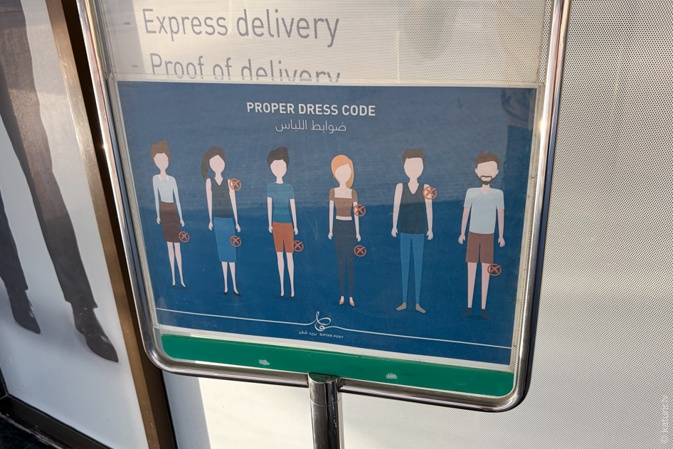 Kaut kādas dreskoda rekomendācijas gan mēdz būt, kā piemēram šī, pie galvenās pasta ēkas. Diezgan šerpi ierobežojumi – oficiāla iestāde tomēr.