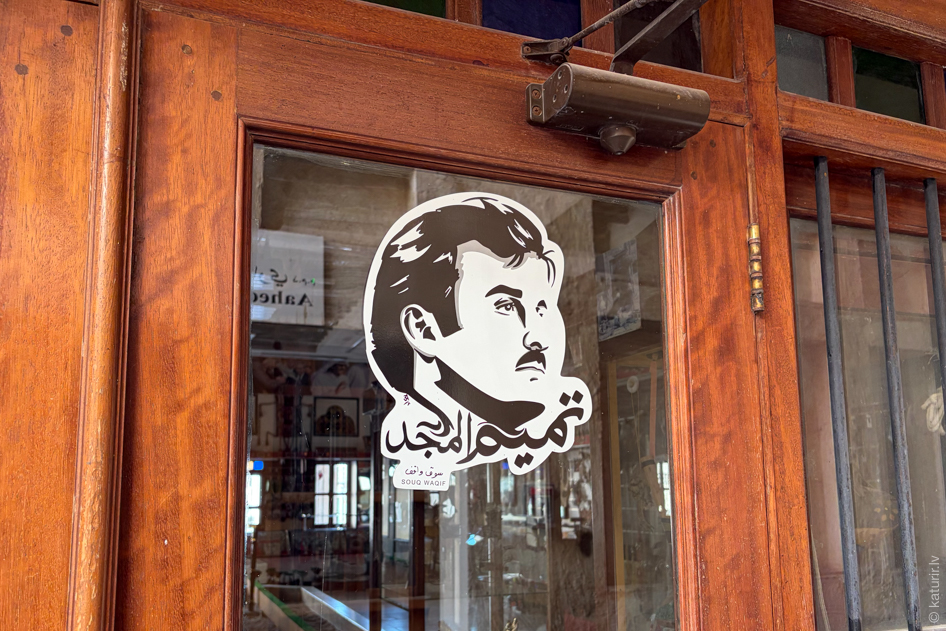 Par valdniekiem runājot, dažviet skatlogos sastopamas šādas, noslēpumainas uzlīmes. Tas ir ļoti atpazīstams stilizēts Tamīma bin Hameda bin Halīfa al Tānī portrets ar uzrakstu arābiski Tamim al-Majd, kas nozīmē Tamims – slava / gods.