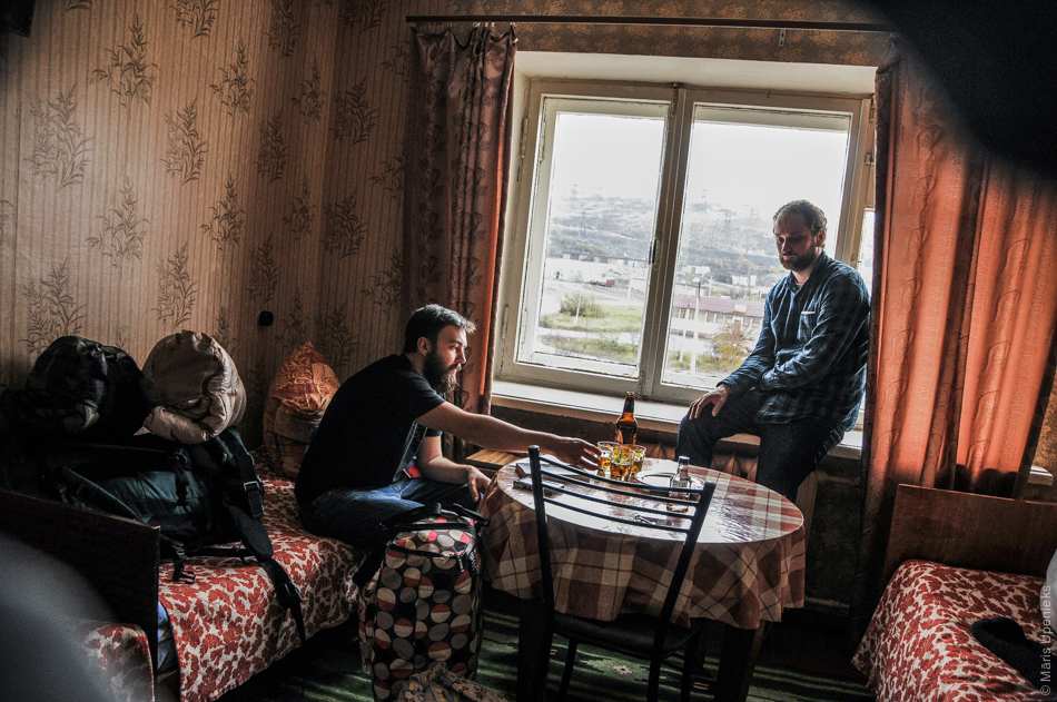 Viesnīca atrodas parastas mājas trešajā stāvā un realitātē ir kojas rūpnīcas strādniekiem. Trenuškas, makaronu vārīšana virtuvē, visa klasika. Bildē – puse ceļojuma komandas, askētiskas pusdienas.