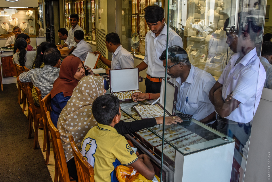 Kā daudzviet Āzijā, arī Kolombo ir preču grupu kvartāli. Piemēram, ja dārglietas – tad visa iela vienu vai vairākus kvartālus būs blīvi pilna ar to veikaliem. No mūsu viedokļa – konkurence. No viņu – ērtība salīdzināt cenas un piedāvājumu. Un starp citu – šajās zeltlietu bodēs izrādās negaidīti daudz pircēju. Investīcija.