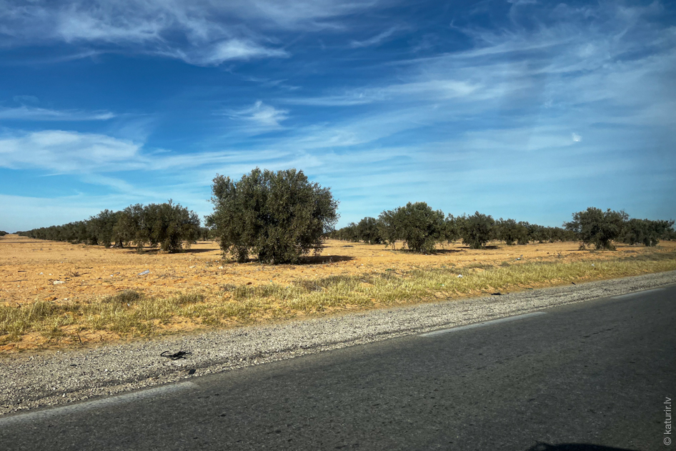 Galvenā piekrastes Tunisijas ainava šosesju malās ir bezgalīgas olīvkoku audzes, strīpām vien, nereti līdz pat apvārsnim. Interesanti, ka starp kokiem atstāta mežonīga atstarpe. Mans minējums – sausajā klimatā sakņu sistēma katram kokam izveidojas maksimāli plaša, lai tiktu klāt visām iespējamajām, retajām lietus pilēm. Attiecīgi koki tad arī tiek laicīgi paretināti, lai tiem nevajadzētu lieki konkurēt par ūdeni.
