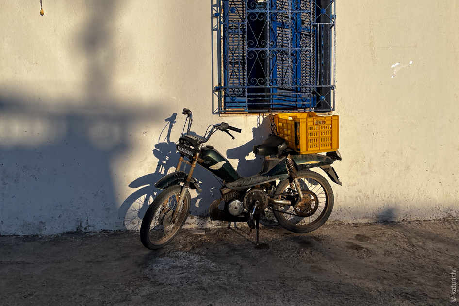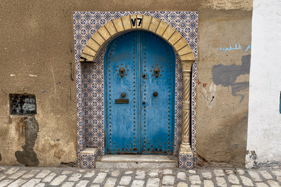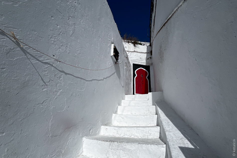 Taču viena aspekts gan nekautrējas izrādīt savu daili – durvis un logus tunisiešiem jau vēsturiski paticis taisīt košus un cakainus. Iecienītākais tonis ir debesu zilais, kas vecpilsētās vietām rada tādu Santorini izstrādājuma sajūtu.