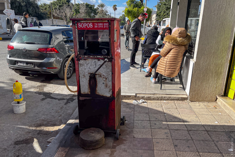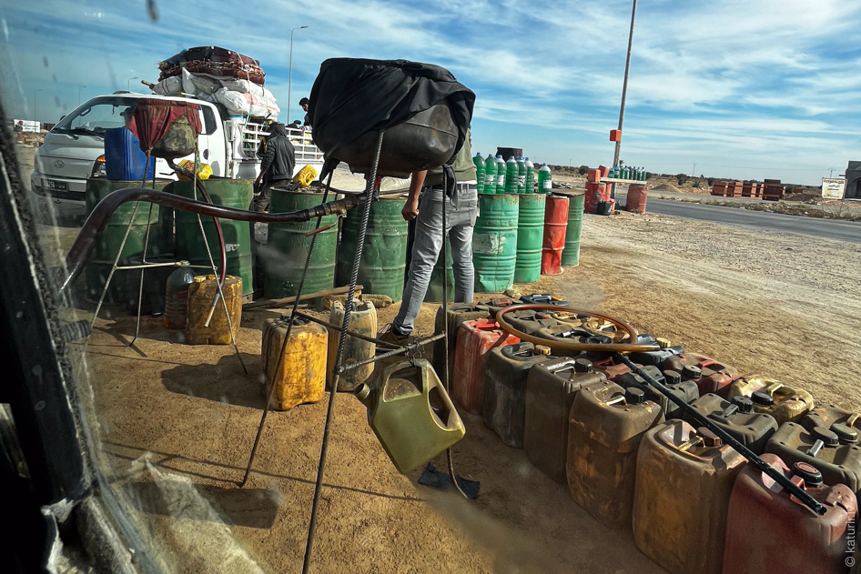 Kad beidzot dodamies ceļā, drīz seko nākamā spilgtā lokālā pieredze – uzpildīšanās nelegālā benzīntankā ceļmalā, burtiski no degvielas kannu kaudzes. Interesanti, ka Tunisijā ir pa pilnam normāla izskata funkcionālu benzīntanku, taču šāda viltīga izvēle šoferim droši vien palīdz ietaupīt un attiecīgi nopelnīt pāris naudiņas vairāk. Vēlāk arī izlasu, ka šī esot nelegāla kontrabandas degviela no Alžīrijas un Lībijas. Kā vietējās varasiestādes ko tādu pieļauj? Visticamāk, ka atbilde sākas uz K un beidzas ar orupcija.