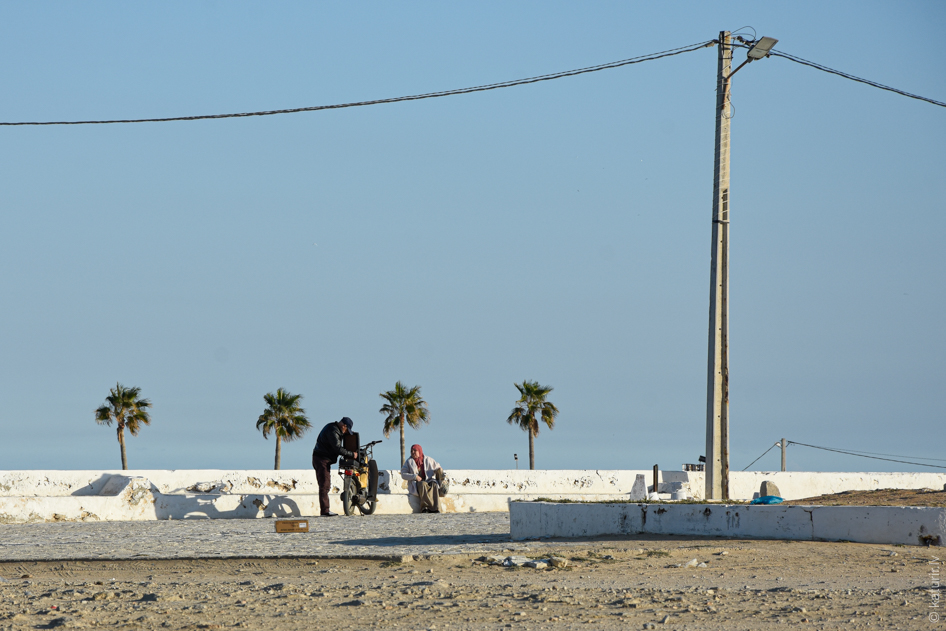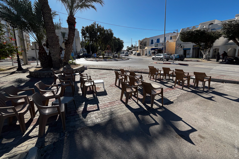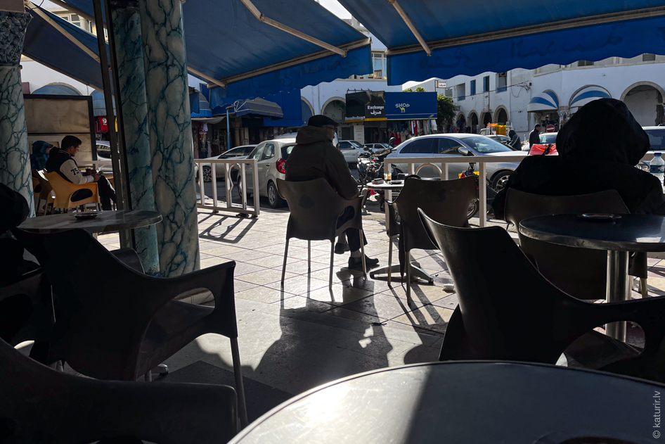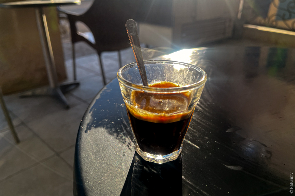 Pirmā lieta, ko izdaru attopoties Houmt Souk – lielākajā Džerbas salas pilsētā – ir iezvelties pirmās ceļā pagadījušās, maķenīt dzīves apskrambātās kafejnīcas aicinošajā plastmasas sēdeklī. Maģiskā frāze Un cafe noir s’il vous plait mani drīz vien nodrošina ar rīta saules gaismā kūpošu stikla glāzīti, tikai līdz pusei pilnu ar darvas melnu, aromātisku eliksīru. Izrādās, populārākais kafijas formāts Tunisijā ir maztrauciņos pildīts espresso. Šāds šotiņš teju visur standartā maksā tikai divus dinārus, jeb sešdesmit eirocentus. Malkoju karsto, gardo, pēc negulētās nakts smadzenē enerģiju atjaunojošo šķidrumu un jūtu, ka šis skaistais rituāls būs bieža un neatņemama manas Tunisijas miniodisejas sastāvdaļa.