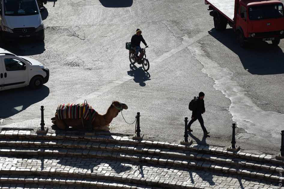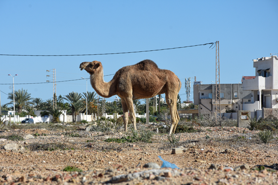 Par spīti tam, ka Tunisija ir pavisam īsta tuksneša valsts, uz reāliem kamieļiem sanāk uztrāpīt tikai ripinoties ar velo gar būvgružiem un atkritumiem pilnu šosejas malu Džerbas salā. Te pārītis tuksneša karaļu ganās, starp akmeņiem un drazu meklējot botāniskus gardumus. Sirds sažņaudzas, redzot, ka abiem skaistuļiem ar īsu virvi ir tuvu viena otrai sasietas priekškājas – lai tie nevarētu paskriet un ātri aizbēgt no saimnieka. Vēlāk manu arī specializētu kamieļu gaļas veikalu, gluži kā Saūdu Arābijā – diez kas nav.