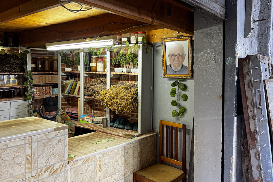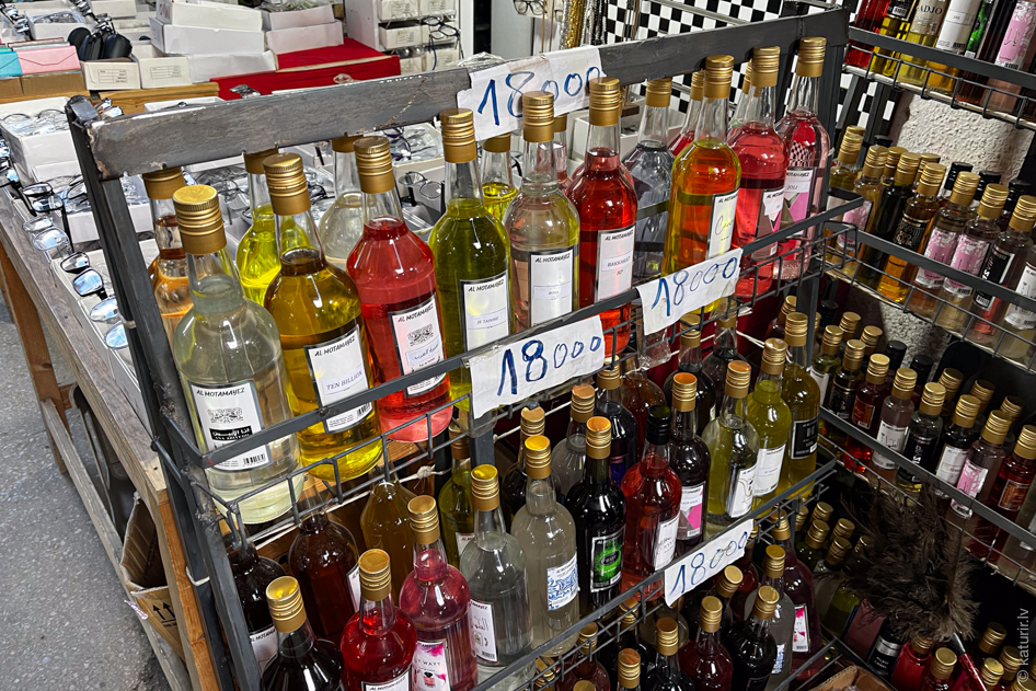 Pabeidzot apgaitu pa tirgu, uzskrienu uz krāsainām alkohola pudelēm! Vai tiešām? Aprunājoties ar saimnieku, viss noskaidrojas – šādi te tiek pārdoti dažādi parfīmi, iespaidīgos tilpumos.