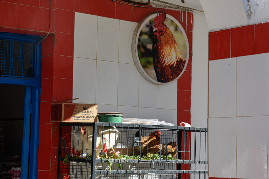 Tikpat praktiska te ir arī vistiņu tirdzniecība. Svaigu vistiņu, piebildīšu. Lai nebūtu jākurina ledusskapis, tās tiek turētas šādos necilvēciskos sprostos turpat pāri pagalmam no gaļas veikala ieejas. Kad nopērc tādu, blaukš, un svaigs cāļa ķermenītis ir maisiņā nesams uz mājām šmorēt. Ļoti nežēlīgi, ļoti efektīvi.