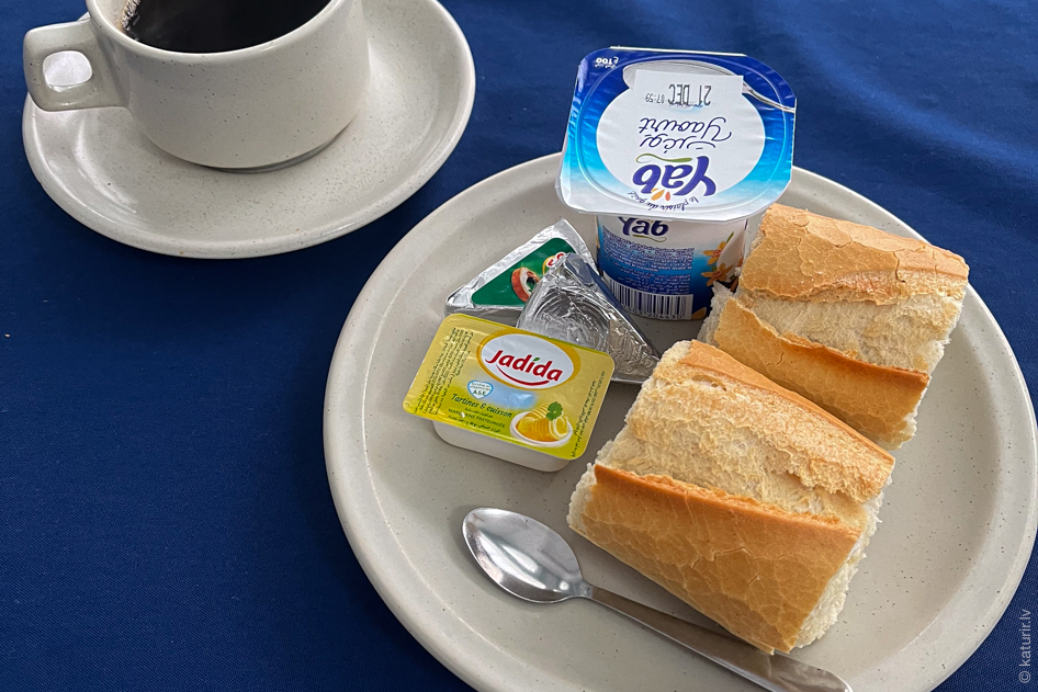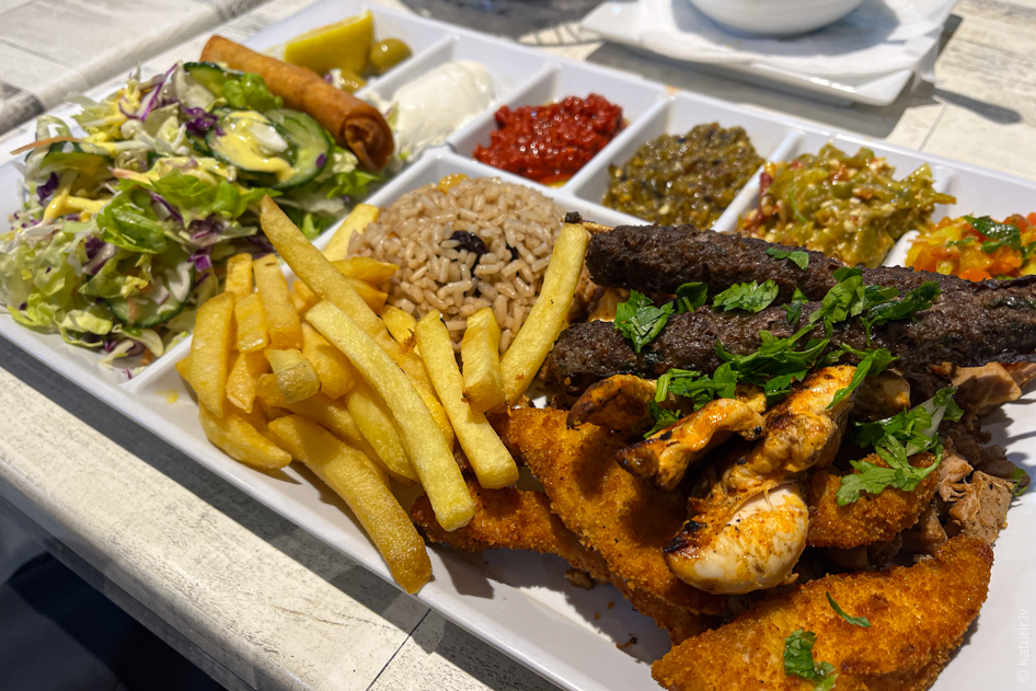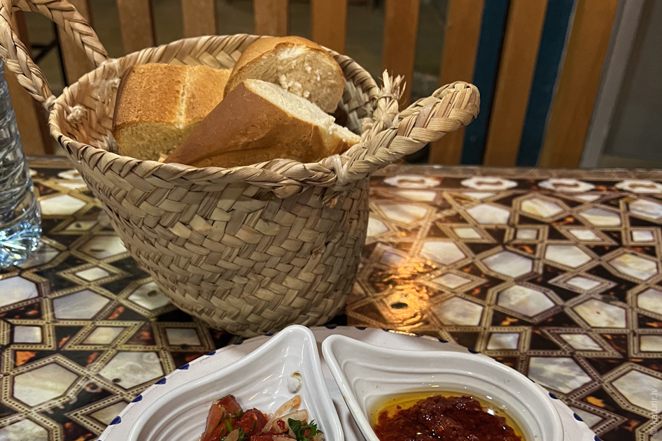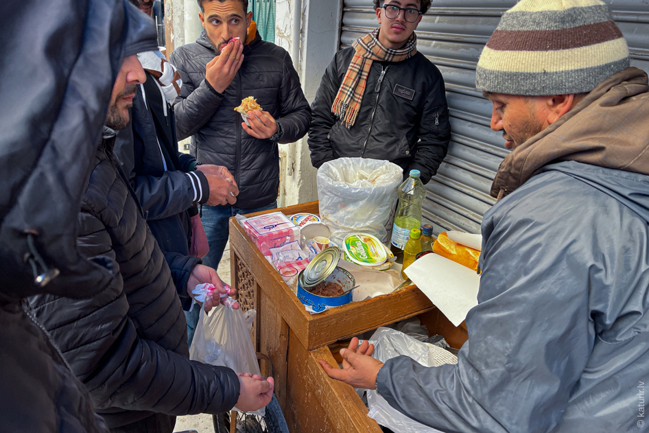 Uz pavisam milzīgu porciju uztrāpos kādā tunisiešu ātrās ēdināšanas uzņēmumā – tiek atnesta maize, zupa un vēl šī milzīgā palete ar dažādiem maziem uzkodu varientiem – kopā vēl ar litra ūdens pudeli viss izmaksā aptuveni sešus eiro. Cenas šeit tiešām ir ļoti patīkamas.