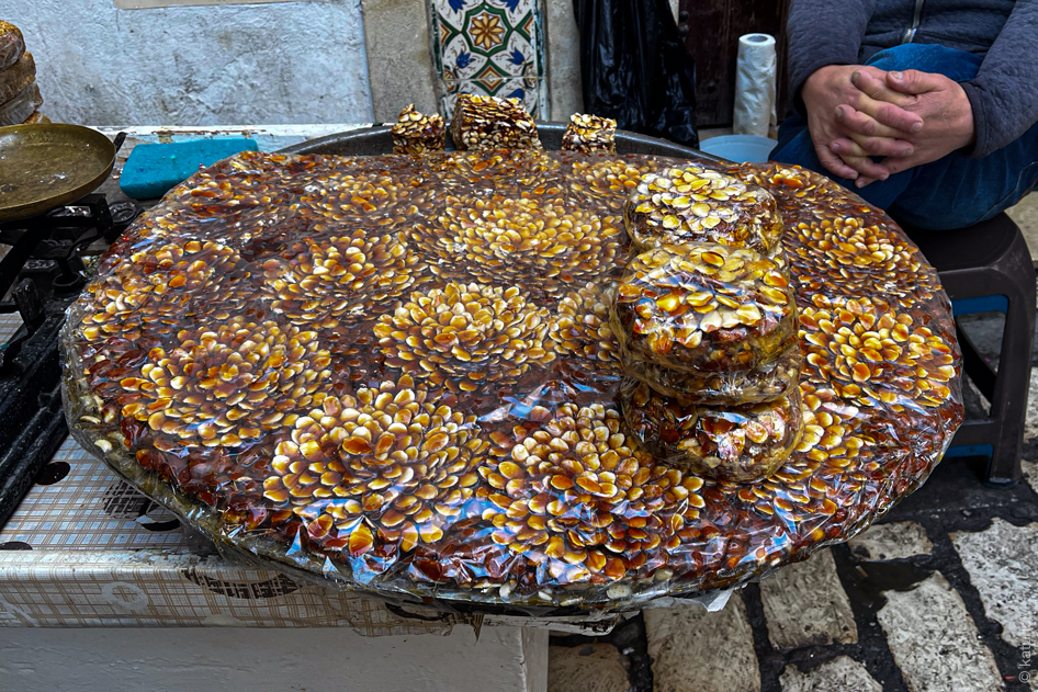 Un saldajā – vietējā cukuroti karamelizētā delikatese ar šķēlētiem riekstu gabaliņiem. Arī izskatās tā, ka uzreiz mierīgi varētu likt modernās mākslas muzeja ekspozīcijā.