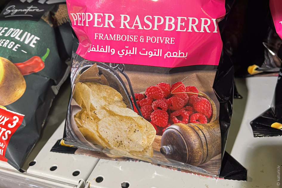 Našķi? Var nobaudīt interesantu vietējo čipšu variāciju – avenes un pipari. Pamēģināju – jāsaka, ka garšas notīs var just spēcīgu Mendeļejeva tabulas klātbūtni.