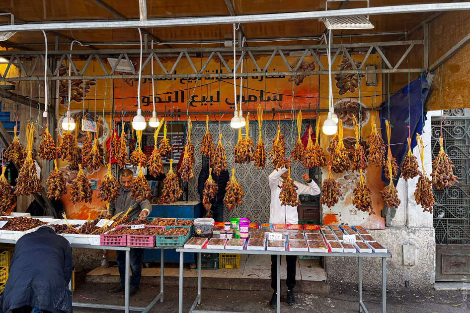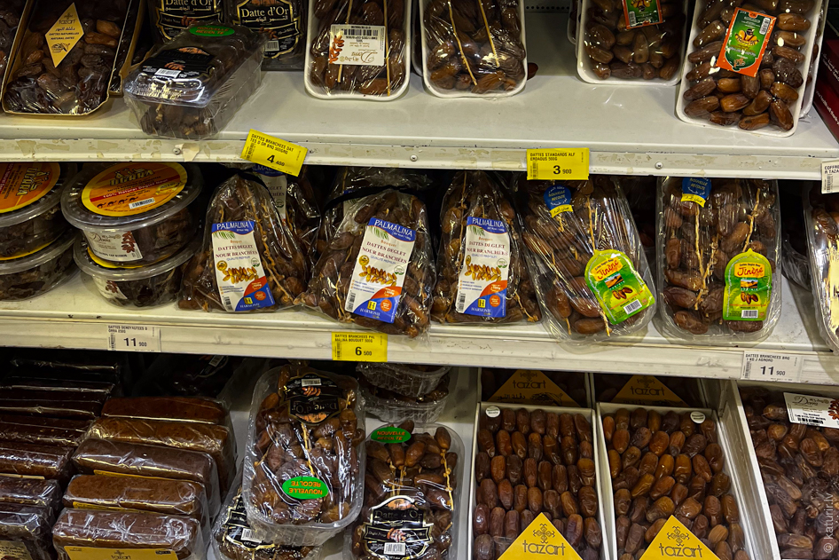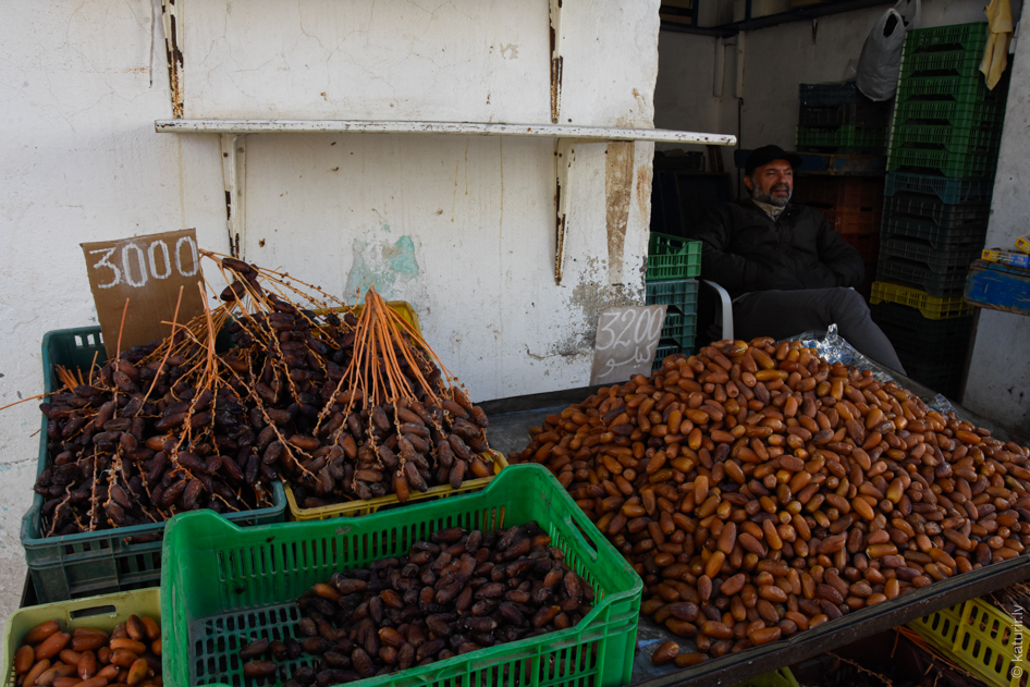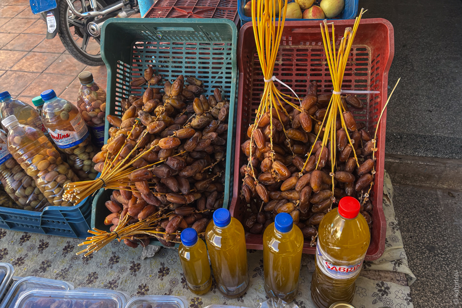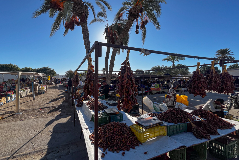 Galvenais tunisiešu saldums. Dabūjamas daudz un lēti. Tirgojas arī dateļpalmas zaru buntēs.