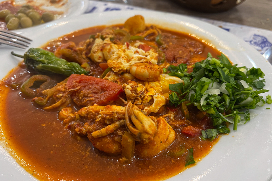 Lai gan izskatās kā vienreiz jau lietots, oudža ar jūras veltēm kļūst par manu iecienītāko ēdienu šī ceļojuma laikā – dažādās vietās pasūtu to vismaz trīs reizes.