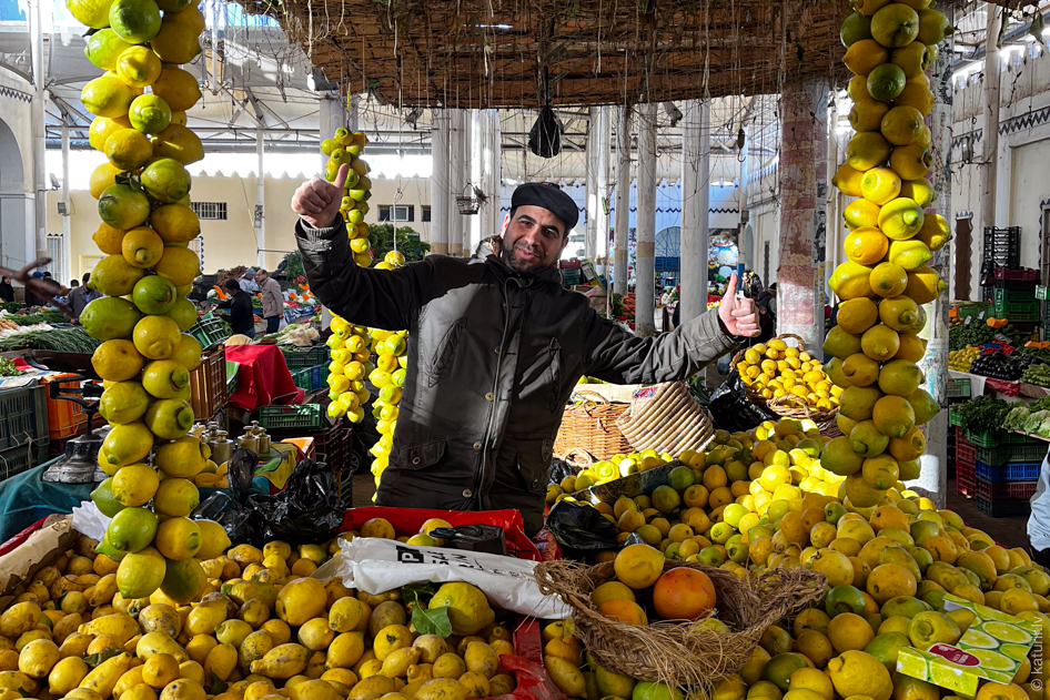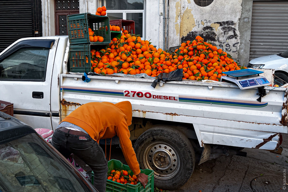 Visu iespējamo kalibru tirdzniecība Tunisijas pilsētu ielās ir kurp vien paskaties. Lūk, mandarīnu tirgotājs atvedis savu preci uz pilsētu turpat pikapa kravas kastē un tai smuki pieskaņojis arī savu džemperi.