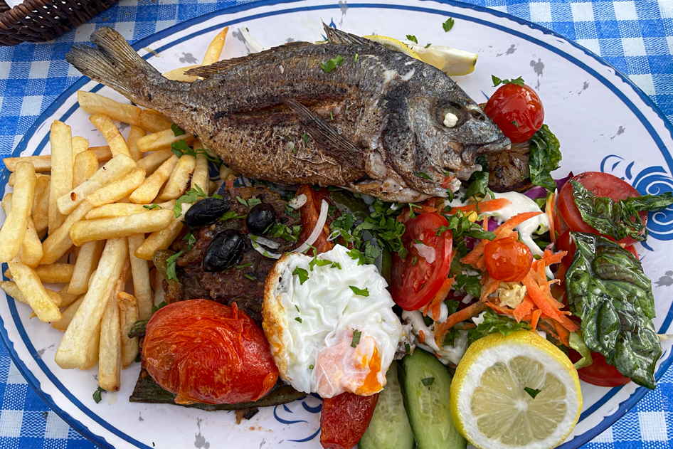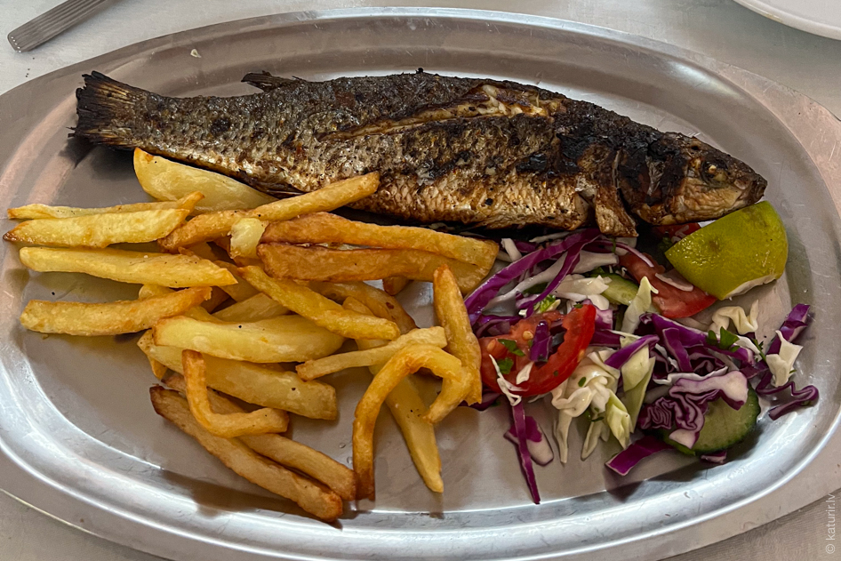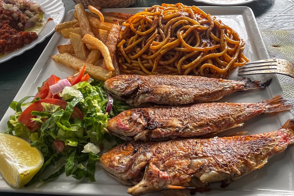Kādu restorāniņu apmeklēju vairākas reizes un izbaudu oficianta dusmu par vakar neatstāto dzeramnaudu (jo maksāju pie kases pēc vietējo ēstuvju principa, nenoorientējos) – zivi kuskusā atnes, nomestu uz blakusšķīvja. Šis ir tas pats ēdiens, kas iepriekšējā attēlā. Protams, šoreiz labojos, atstāju pāris dinārus ņiprajam kungam un viņš smaida kā apaļa jūlija saulīte.